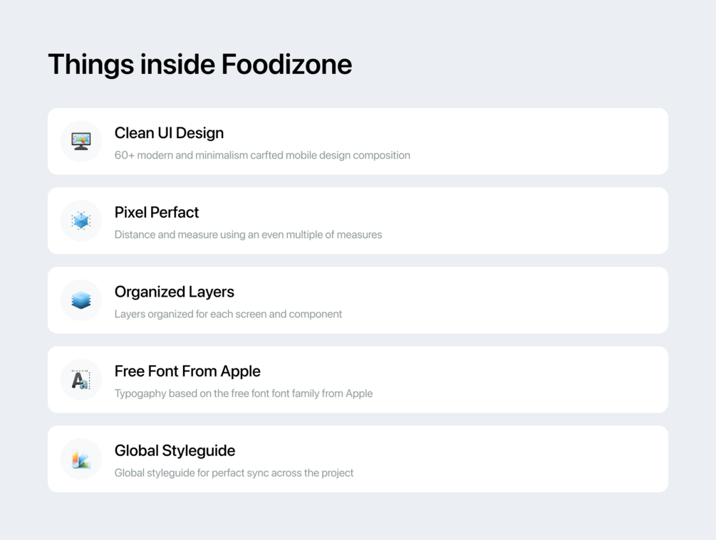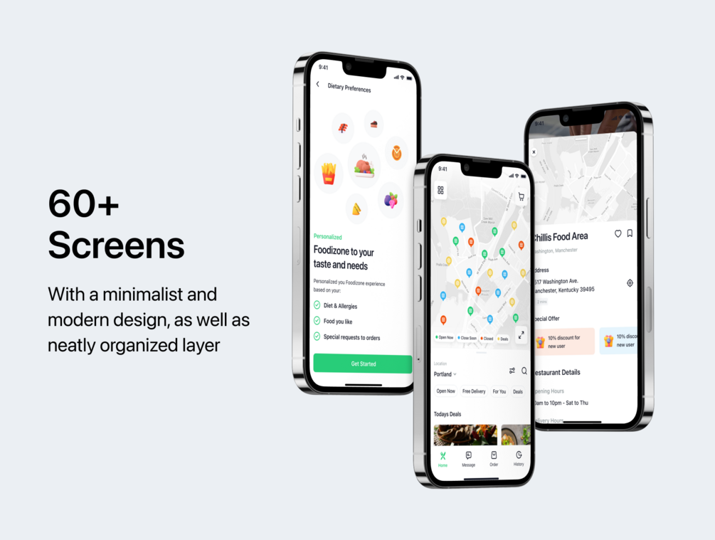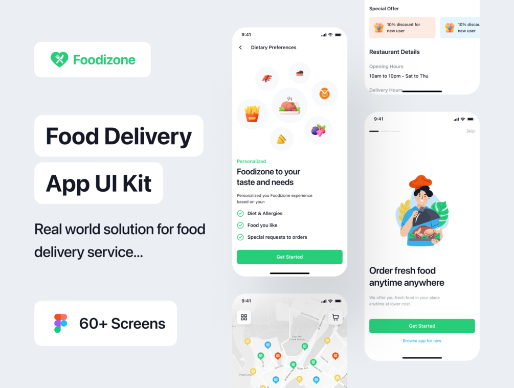 Foodizone is a Premium Food Delivery App UI Kit consisting of 65 pixel-perfect screens and is easy to use in Figma. The kit is easy to fully customize to your liking and it leverages all Figma features, including global color, font styles, and dynamic components.